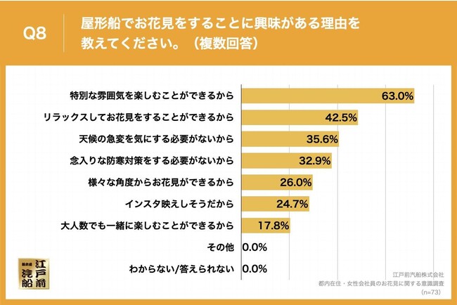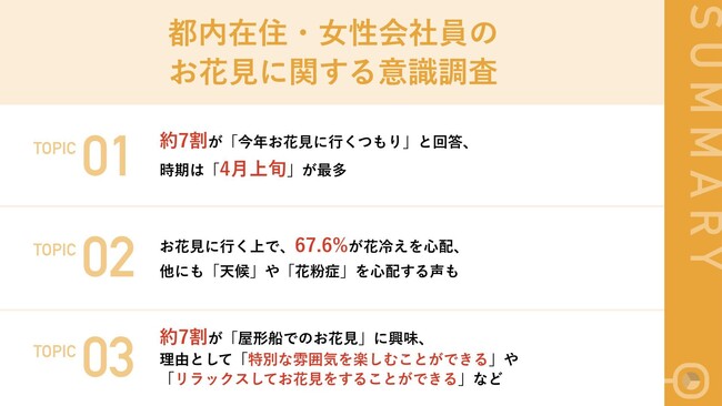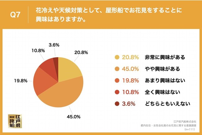 なお、お花見に行く上で、「天候」や「花粉症」以外にも、約7割が花冷えを心配していることが分かりました。また、「規制無しは久しぶりなので渋滞しそう」や「お弁当などを自由にたべられるのか」などの声も挙がっており、「特別な雰囲気を楽しむことができる」という理由の他、「リラックスしてお花見をすることができる」や「天候の急変を気にする必要がない」などの理由から、約7割の女性会社員から「屋形船でのお花見」に興味を示す声が挙がりました。