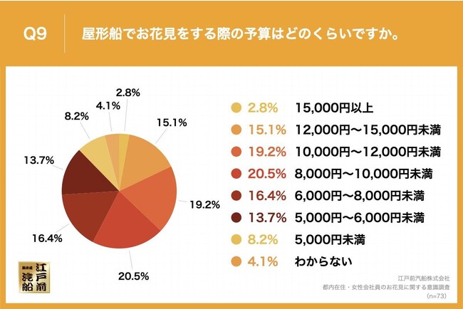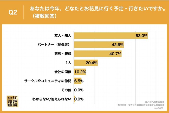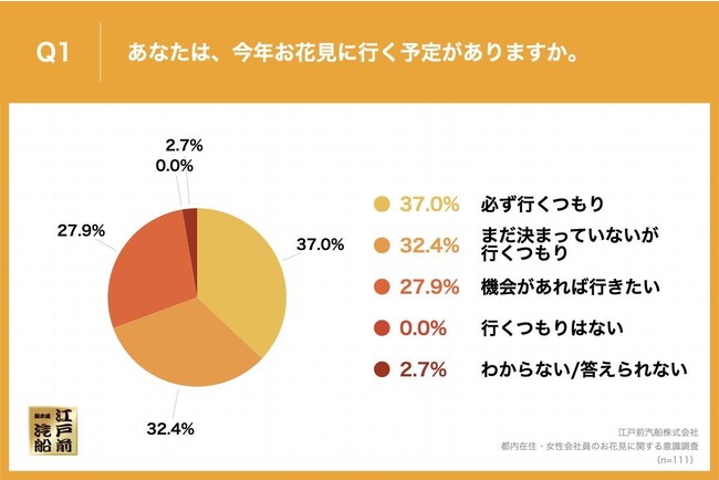 浜友グループの江戸前汽船株式会社(本社:東京都江東区、代表取締役:後藤武彦)は、お花見に行ったことがある都内在住の20代〜40代女性会社員111名に、都内在住・女性会社員のお花見に関する意識調査を実施いたしましたので、お知らせいたします。