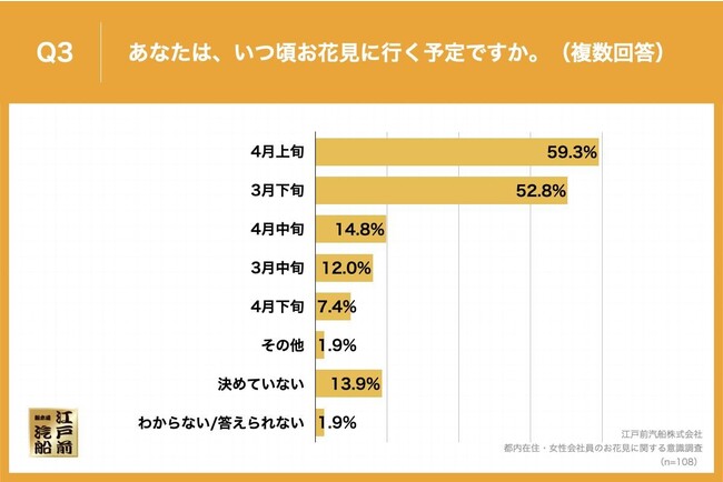 そこで、「お花見」について都内在住の女性会社員に尋ねると、約7割が「今年は行くつもり」と回答しており、「4月上旬」の時期を検討している人が多いことが分かりました。
