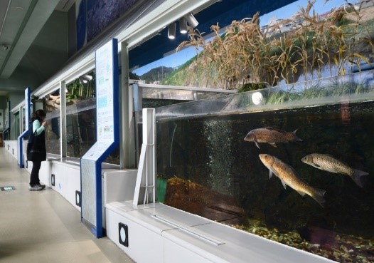 2階には、高槻市の北部山間から淀川につながる芥川の上流・中流・下流をイメージした幅6メートル高さ1.1メートルのジオラマ水槽を3台設置。同規模の淡水魚水槽がある博物館は大阪府内では当館だけで、カワムツ・オイカワ・コイなど芥川に生息する約300匹の姿をじっくりと観察することができます。