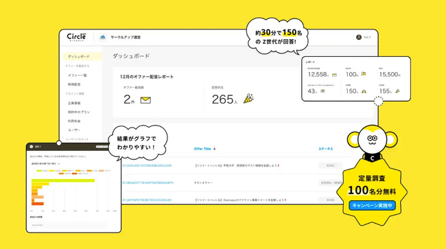 サークルアップは電通若者研究部が自らの研究ツールとして開発し、2022年6月に当社が事業売却を受けたクイックリサーチツール。約2万人の現役大学生が登録しており、100サンプルの調査が10〜30分で完了するなど、そのスピード感が特徴で、多くの企業様のマーケティング活動やリクルーティング活動にご活用いただいています。