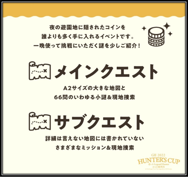 タカラッシュがお届けする史上初のオールナイト宝探し。300人限定で行われるイベントで、選ばれた者「プロハンター」のみが参加できる優勝賞金1,000万円のリアル宝探し「GIチャンピオンシップ大会」の前哨戦となる大会です。上位10位に入賞した参加者には豪華商品のほか、優勝賞金1,000万円の「リアル宝探し大会」へ参加できる「プロハンターゼロ」の資格を手に入れることができます。今回、挑戦できるクエストはメインクエストとサブクエストの2種類。誰よりも多くのコインを獲得して豪華賞品を手に入れるイベントとなります。