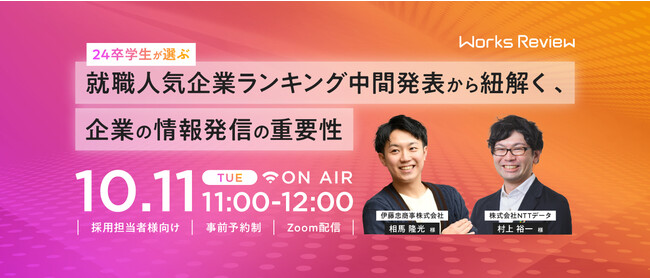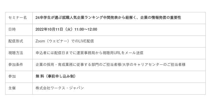 株式会社ワークス・ジャパン(本社:東京都千代田区、代表取締役:清水信一郎、以下 ワークス・ジャパン)は、2022年10月11日(火)に、採用業務に従事する部門のご担当者様を対象にしたオンラインセミナー「24卒学生が選ぶ就職人気企業ランキング中間発表から紐解く、企業の情報発信の重要性」を開催します。参加無料、事前申込制、ZOOMで配信します。