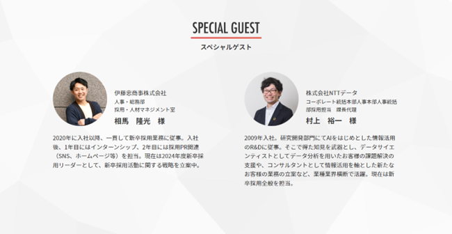 今回は中間結果発表にて文系総合・理系総合の1位にランクインされた伊藤忠商事様、NTTデータ様にご登壇いただき、ここまでの24卒採用での具体的な取り組みや情報発信方法をお伺いしながら、学生に支持される企業になるためのヒントをレビューしていきます。