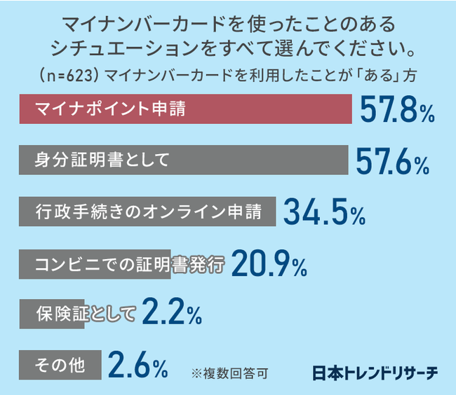 どのように利用しているかについては、「マイナポイント申請」「身分証明書として」という回答が多く挙げられていました。