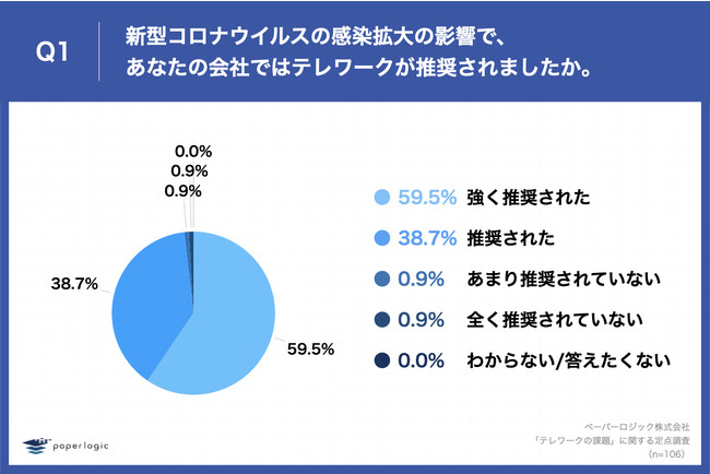 「Q1.新型コロナウイルスの感染拡大の影響で、あなたの会社ではテレワークが推奨されましたか。」(n=106)と質問したところ、「強く推奨された」が59.5%、「推奨された」が38.7%という回答となりました。