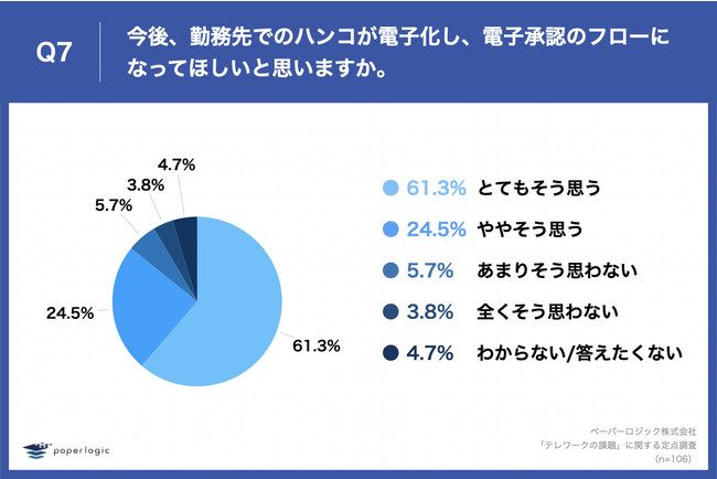 「Q7.今後、勤務先でのハンコが電子化し、電子承認のフローになってほしいと思いますか。」(n=106)と質問したところ、「とてもそう思う」が61.3%、「ややそう思う」が24.5%という回答となりました。
