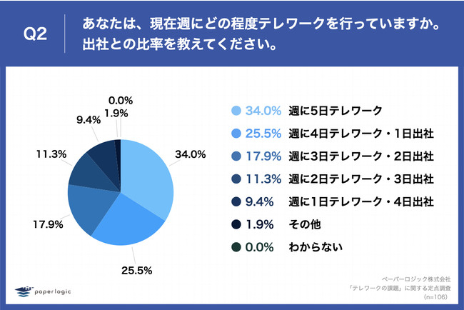 「Q2.あなたは、現在週にどの程度テレワークを行っていますか。出社との比率を教えてください。」(n=106)と質問したところ、「週に5日テレワーク」が34.0%、「週に4日テレワーク・1日出社」が25.5%という回答となりました。