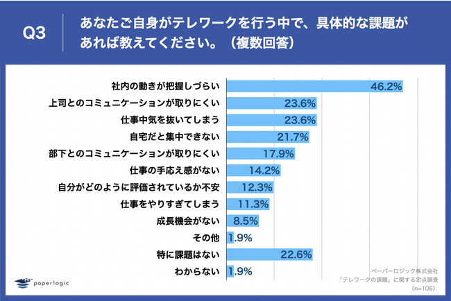 「Q3.あなたご自身がテレワークを行う中で、具体的な課題があれば教えてください。(複数回答)」(n=106)と質問したところ、「社内の動きが把握しづらい」が46.2%、「上司とのコミュニケーションが取りにくい」が23.6%、「仕事中気を抜いてしまう」が23.6%という回答となりました。
