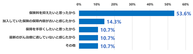 また、「加入していたが他の保険商品に切り替えた」と回答した方を対象に、加入中の保険を切り替えた理由を伺ったところ、「保険料を抑えたいと思ったから」が53.6%と最も多く、続いて「加入していた保険の保障内容が古いと感じたから」が14.3%となりました。(回答者数:28人)