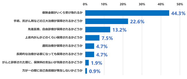 がん保険の保障内容で重視したポイント(複数選択可)について、「保険金額がいくら受け取れるか」が44.3%と最も多く、次いで「手術、抗がん剤などの三大治療が保障されるかどうか」が22.6%、「先進医療、自由診療が保障されるかどうか」が13.2%と続きました。