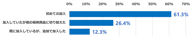 がん保険の加入について、「初めての加入」が61.3%と最も多く、続いて「加入していたが他の保険商品に切り替えた」が26.4%、「既に加入しているが、追加で加入した」が12.3%となりました。