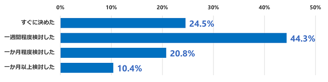 がん保険加入までの検討期間について、「一週間程度検討した」方が44.3%と最も多く、続いて「すぐに決めた」方が24.5%となりました。
