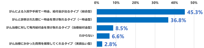 がん保険の保障内容について、「がんによる入院や手術で一時金、給付金が出るタイプ(総合型)」を選んだ方が45.3%と最も多く、続いて「がんと診断された際に一時金を受け取れるタイプ(一時金型)」を選んだ方が36.8%となりました。