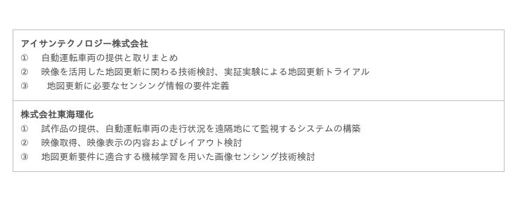 今回の共同開発内容として、アイサンテクノロジー株式会社は、自動運転車両から得られた映像等を活用し、地図更新技術の研究開発を行っていきます。また、株式会社東海理化はこれまでドライバーへ後方の道路状況を広範囲にわかりやすく表示する電子ミラーなど、カメラ及び、画像処理開発で培った技術を活かし、 自動運転車両の遠隔監視を可能とするカメラ映像表示システムの実現に向けた最適な映像表示形式の調査・研究開発を実施します。