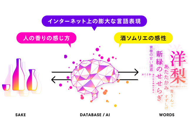 日本酒ソムリエAI「KAORIUM for Sake」は、インターネット上の膨大な言語表現と人の香りの感じ方を学習したAIに、1万以上の日本酒の風味・感性データと酒ソムリエの感性を融合させた最先端のAIシステムです。自然言語処理によって、表現の難しい日本酒の風味を、わかりやすい言葉で表したり、ある言葉に紐づく日本酒を導き出することを可能にします。