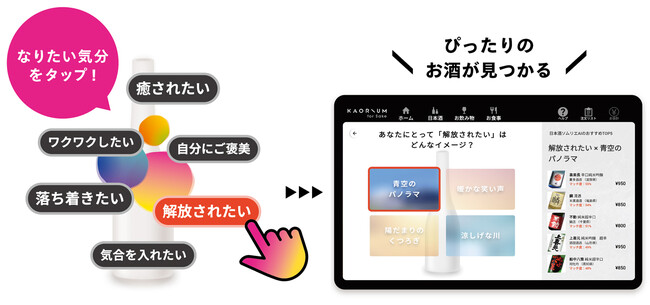 種類の多い日本酒はどれを選んでいいかわからないもの。KAORIUM for Sakeは、「解放されたい」「ワクワクしたい」といったなりたい気分や、「個性的」「フルーティ」といった好みの味わいに合わせて、AIが店頭にある日本酒とのマッチ度を解析し、ぴったりのお酒をレコメンドします。これにより、直感的に今欲しいお酒を選ぶことができます。