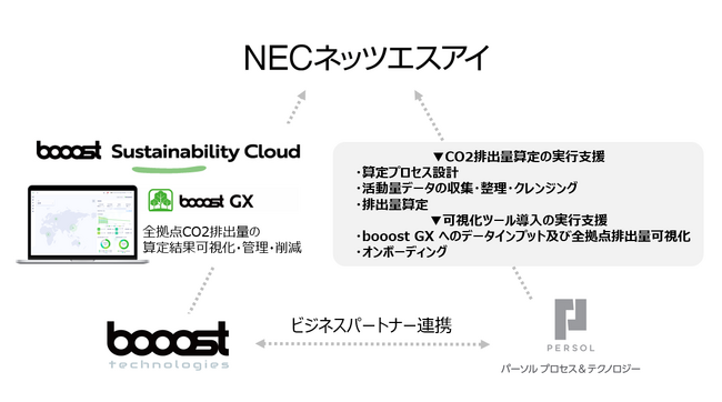 また、当社パートナー企業であるパーソルプロセス&テクノロジー株式会社(東京都江東区、代表取締役社長:市村 和幸、以下 パーソルP&T)では以前よりNECネッツエスアイに向けサービス提供してきた、CO2排出量の算定・可視化の領域におけるデータ分析、業務手順の見直し、構築、算定の実行などの支援による工数削減などを通し、カーボンニュートラルの達成に向け、持続可能なCO2排出量可視化の構築に貢献しました。これまでの支援を踏まえ、今回新たに「booost GX」 で使用する活動量データの収集・整理・インプットなどツール導入・効率化などの支援を実施しています。