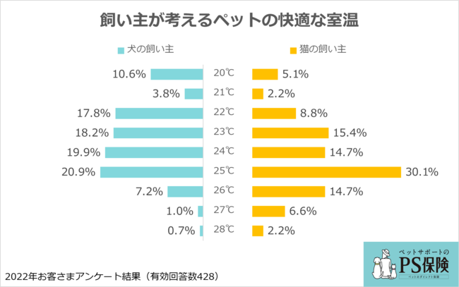 また、外出する機会が多い犬に屋外対策を、一日のほとんどを室内で過ごす猫に室内対策を重視するという傾向がうかがえます。犬と猫ともに最重要視される室内対策は「室温管理」であり、飼い主が思うペットの快適な室温は25℃が最多でした。この温度は、犬や猫にとって考えられる適温と合致するという結果となりました。