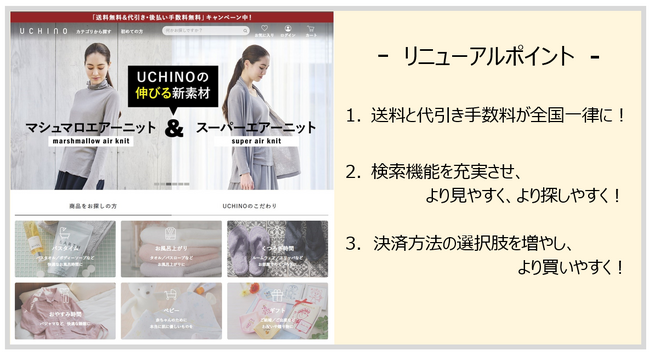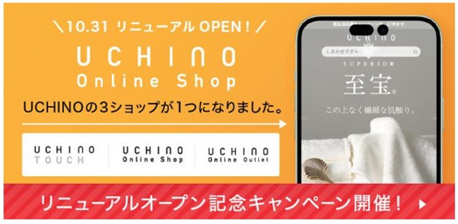 バスタイムから快眠まで、健やかで心地よいライフスタイルを提案する内野株式会社(本社:東京都中央区/代表取締役社長:内野信行)は、サービス機能をさらに充実させるために、自社運営の3つのオンラインショップ「UCHINO Online Shop」「UCHINO TOUCH」「UCHINO Online Outlet」を統合し、2023年10月31日(火)にリニューアルオープンしたことをお知らせいたします。サイトの統合により、商品検索がしやすくなり、支払いや配送手続きもまとめてできるようになりました。リニューアルオープンを記念して、お得なキャンペーンも開催いたします。(https://uchino.shop/)