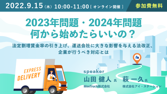 INEST株式会社の連結子会社である株式会社アイ・ステーションは、2022年9月15日(木)10時より「2023年問題・2024年問題何から始めたらいいの?〜法定割増賃金率の引き上げ、運送会社に大きな影響を与える法改正、企業が行うべき対応とは〜」をテーマに講師をお招きしてオンラインセミナーを開催いたします。