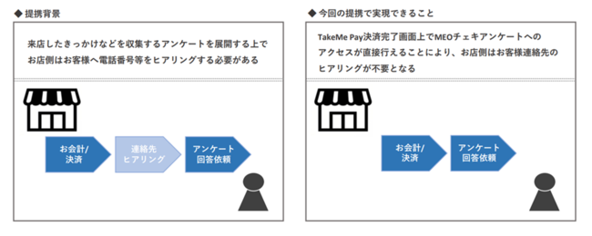 これまでGoogleマップやYahoo!地図などの来店効果は、「MEOチェキ」の“口コミ管理依頼機能”を活用する事で測定を可能としてきました。この度、両社のサービスが提携する事により、「MEOチェキ」導入店舗はお客様の電話番号やメールアドレスを収集する事なく、「TakeMe Pay」の決済画面上で来店理由などのアンケートを展開する事が可能となります。取得するアンケートデータは、決済と同時にお客様へ展開され、お店に対するリアルなフィードバックが反映された声を収集する事が期待されます。