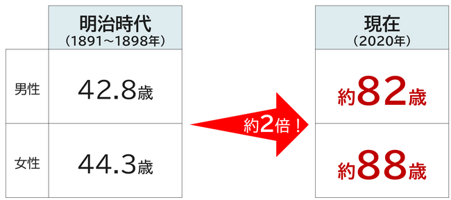 金融リテラシーの必要性が高まってきている背景として、日本の長寿化があげられます。過去の調査結果をみると、1891〜1898年(明治24〜31年)の平均寿命は、男性が42.8歳、女性が44.3歳でした(年度に幅があるのは、公表数値が複数年の平均値であるためです)。明治時代の平均寿命は50歳にも満たなかったわけです。しかしその後、平均寿命は延びていき2020年には男性が約82歳、女性が約88歳となりました【図表1】。