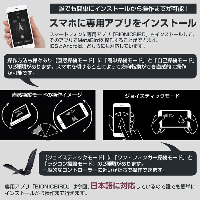 スマートフォンに専用アプリ「BIONICBIRD」をインストールして、そのアプリでMetaBirdを操作することができます。iOSとAndroid、どちらにも対応しています。