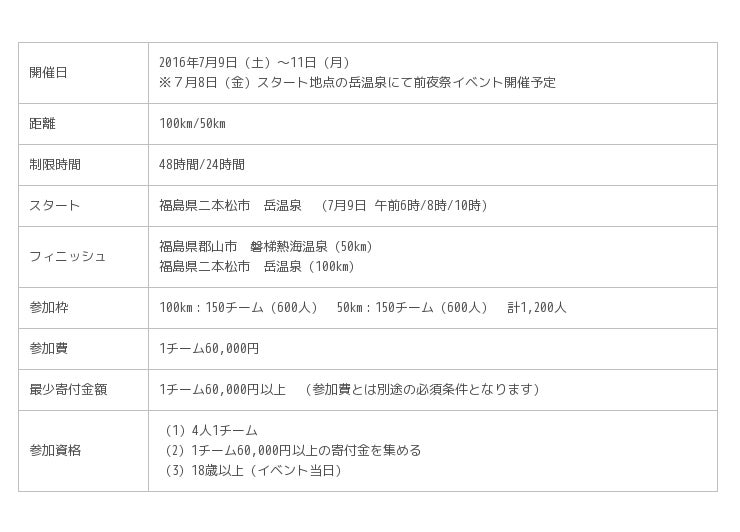 昨年は募集開始早々に定員に達してしまいキャンセル待ちの状態となりましたが、今年は参加枠を昨年の150チーム(600人)から拡大し、100km と50kmで各150チーム、合計300チーム(1,200人)を募集する予定です。