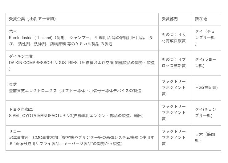 一般社団法人日本能率協会(JMA、会長:中村正己)は、日本およびアジア地域に進出している製造業の生産性や品質の向上、改善活動に成果をあげた工場を表彰する「GOOD FACTORY賞」を2011年に創設し、優秀事例を紹介する活動を行っています。