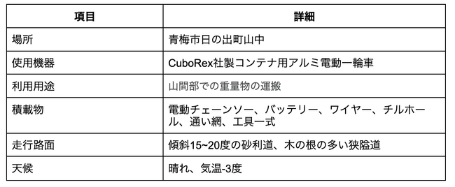 CuboRexの電動一輪車によって山間部工事の重労働を省力化