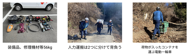 こうした有事の際は、作業員が総重量50kgを超える修理機材を背負って現場まで登頂し改修作業にあたります。到着してからの迅速な対応が重要な現場ですが、機材運搬にかかる労力が非常に大きく、現場作業に取り掛かる前に運搬作業によって体力を大幅に低下してしまう現場も少なくないといいます。