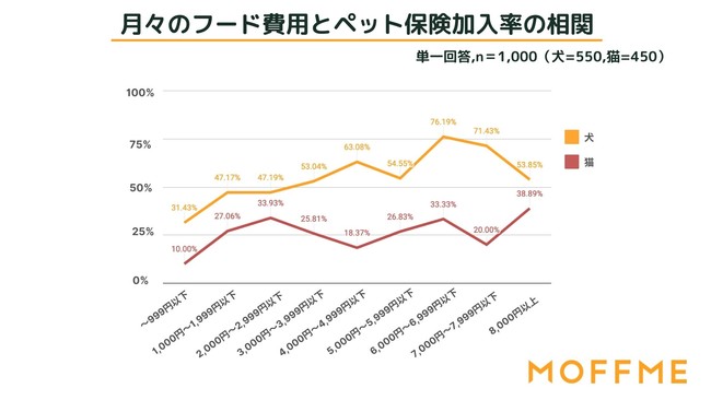犬も猫も両方、ペット保険の加入率と月々のフード費用には正の相関が見られました。