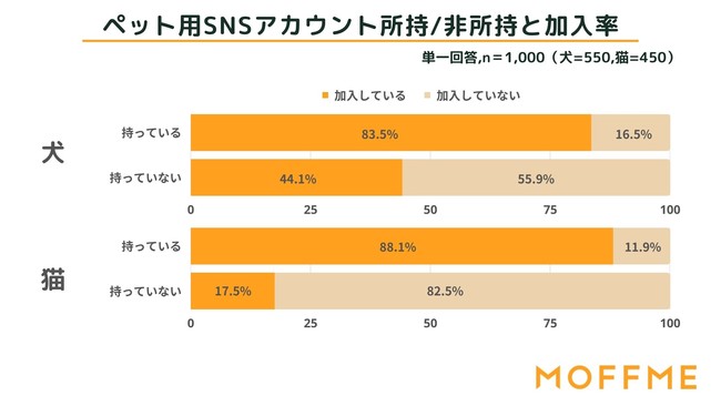 ■ ペット用SNSアカウントの所持/非所持で加入率に大きな差が。特に猫では70%近く差が出る結果に。