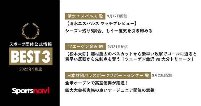 スポーツナビでは毎月、公式情報記事・動画配信において最も印象的だった記事・動画3つを選定し、「スポーツ団体公式記事・動画 月間ベスト3」と称して表彰させていただいております。