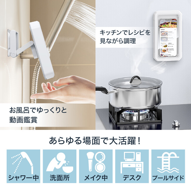 付属のシートを壁に貼り付けて壁掛け設置、背面のスタンドを使用して立てることができるので、お風呂だけでなく使用用途によって使い分けることができます。