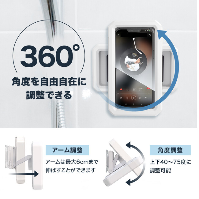 360度回転式なので縦・横自由に調整ができ、前後の角度も上下40〜75度まで調整可能です。