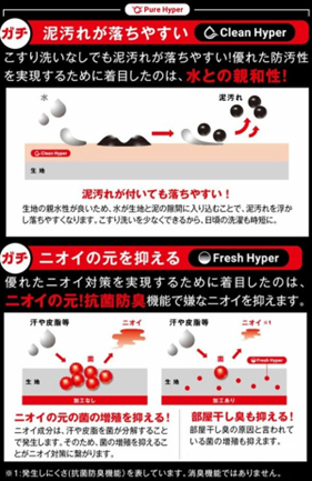 さらに「Pure Hyper」加工で、ニオイの元となる菌の増殖を抑え防臭効果を発揮!部屋干し臭にも効果があります。