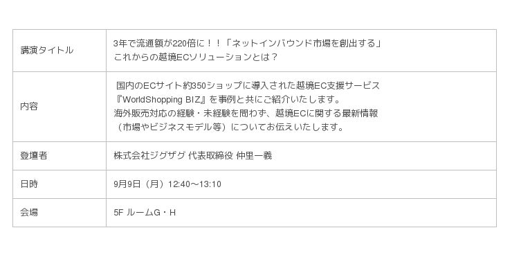 株式会社ジグザグ(本社:東京都渋谷区、代表取締役:仲里一義、以下ジグザグ)は、独立行政法人中小企業基盤整備機構(以下、中小機構)主催の「越境EC“まるごと”フェスティバル2019」に出展し、12:40〜13:10のプレゼンテーションに登壇いたします。
