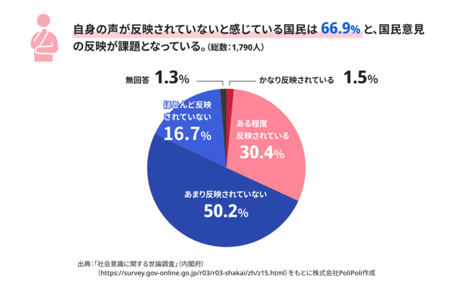 日本は自らの意見が社会に反映されていないと感じる国民が約7割と高い水準になっています。この課題を解決するためには誰でも気軽に行政との仕組みづくりに参加できるツールです。サービス提供を通じて、住民と行政が共に政策を創る「政策共創」ができる社会を目指しています。