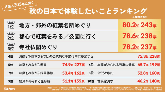 「どの季節の日本を訪れたいですか?という質問」に対し、1位は「秋」で、全体の約5割の人が日本旅行をしたいと回答し、303人の回答者のうち秋の日本旅行で楽しみにしていること(複数回答)として「」243票「」238票「寺社仏閣めぐり」それに次いで、「お祭りや日本ならではの伝統的な季節行事に参加する」、「紅葉をみながらの温泉」と続きました。訪れたい季節として、2位に選ばれた「春」と約3割(89票)の差をつける結果となりました。