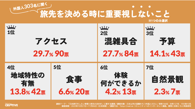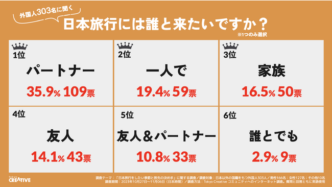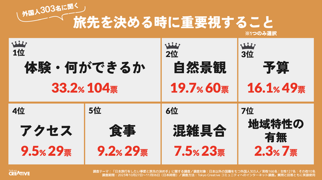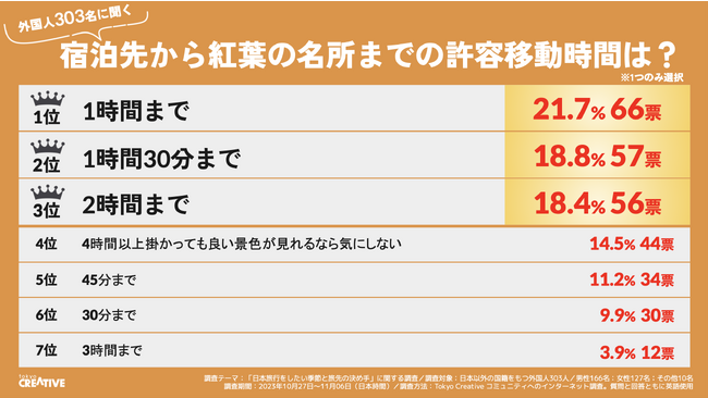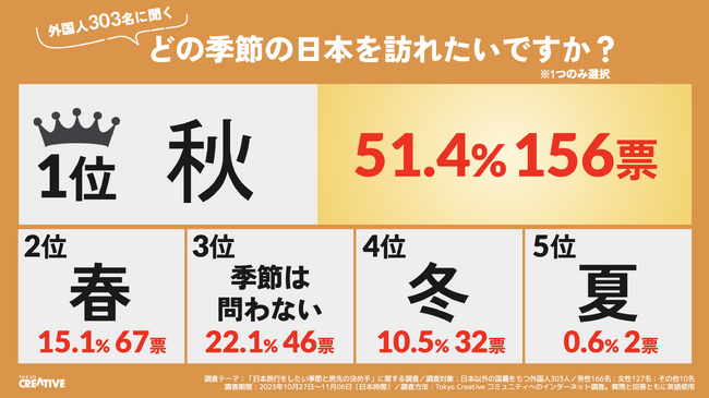 日本人と外国人の“両目線”を生かした動画で自治体や企業の外国人へのアプローチを支援するTokyo Creative株式会社(所在地:東京都墨田区、代表取締役:中川智博・小野沢隆、https://www.tokyocreative.jp/ja/ )は、自社オウンドメディアTokyoCreativeのYouTubeアカウントにて秋の日本旅行に関するガイド動画を配信。そして、外国人303人(欧米豪85%アジアそのほか15%)に対し「日本旅行したい季節と秋の日本旅行」に関する調査を英語で実施しました。