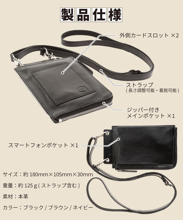 一般的なネックウォレットに比べ、マチが広めにデザインされているため、カードケースやキーケースなどもそのまま収納可能です。外側ポケットにはスマートフォン収納スペースや便利なカードスロットが付いています。