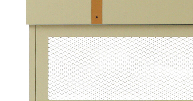 鉄製の無骨なフレームと前面に配したダイヤ型のメッシュニットがインダストリアルな雰囲気。上部の収納スペースは、トランクを置いたようなユニークなデザインです。運転効率を考え、全面は吹き出し口を妨げないように。側面はドレーンや電送カバー、配管などの部品の接続を考慮したデザインになっています。