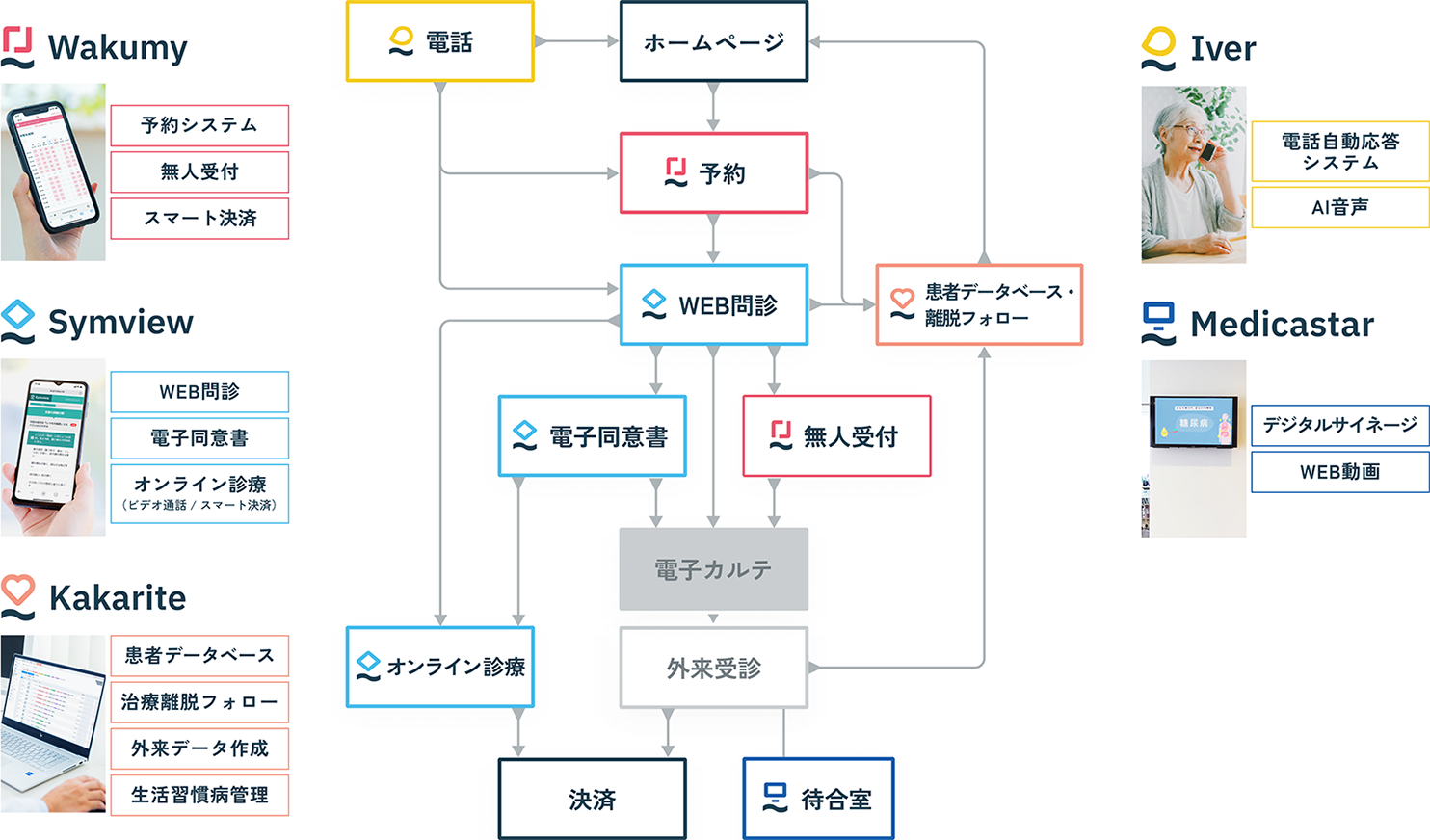 - 患者の受診動線を、レイヤードのプロダクトでトータルに対応することができます。