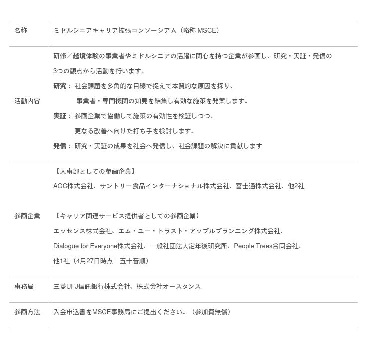 株式会社オースタンス(代表取締役社長:菊川諒人)、三菱UFJ信託銀行株式会社(取締役社長:長島(ながしま) 巌(いわお))は2023年4月28日にミドルシニアの自律的なキャリア形成を目的として「ミドルシニアキャリア拡張コンソーシアム」(略称 MSCE)を設立することとなりましたので、お知らせします。