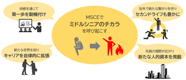 MSCEでは、ビジネスのプロとして日本企業を背負ってきたミドルシニアに対し、現業では得難い新たなきっかけを与え、さらに輝かせることで所属企業を活気付け、ひいては日本社会を底上げすることを目指しています。