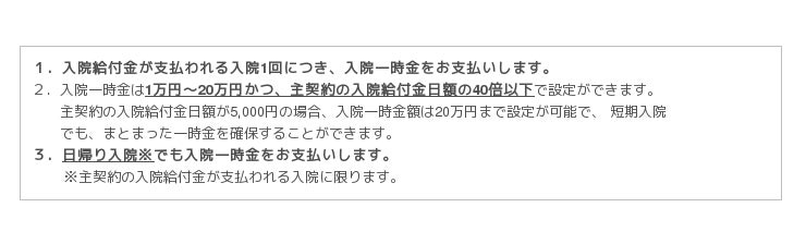 入院一時金:10万円、保険期間:終身、払込方法:口座振替月払