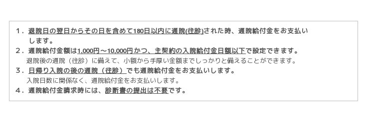 今般、入院期間の短期化や、在宅療養の推進といった医療を取り巻く環境面の変化に対応し、短期入院のための初期費用や入院後の通院に対するお客さまの保障の充実を図ります。