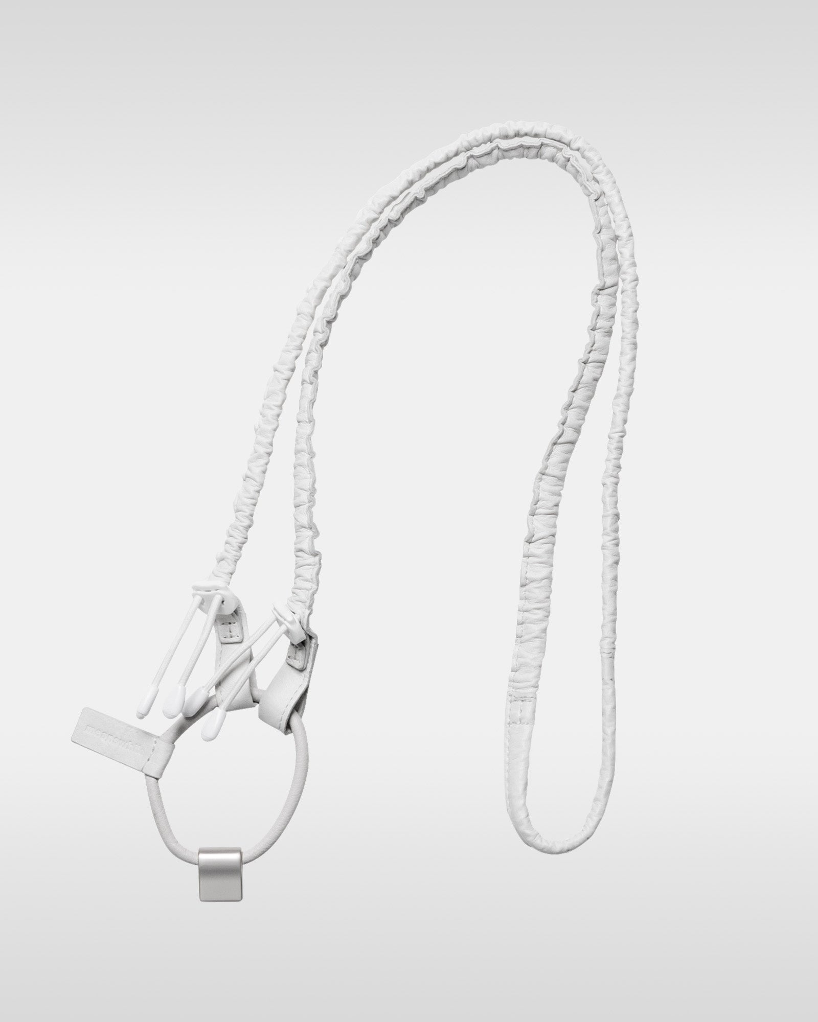 ドローコードによる長さ調整機能とバンジーストラップの伸縮により、身体との調和を生むプロダクトを目指したストラップ。iPhoneの持ち運びがより身体に馴染むよう追求されたデザインであるとともに、ストラップ表面のシワ感がスタイルのワンポイントに。タグ部分には、相互のブランドロゴを素押しであしらいました。